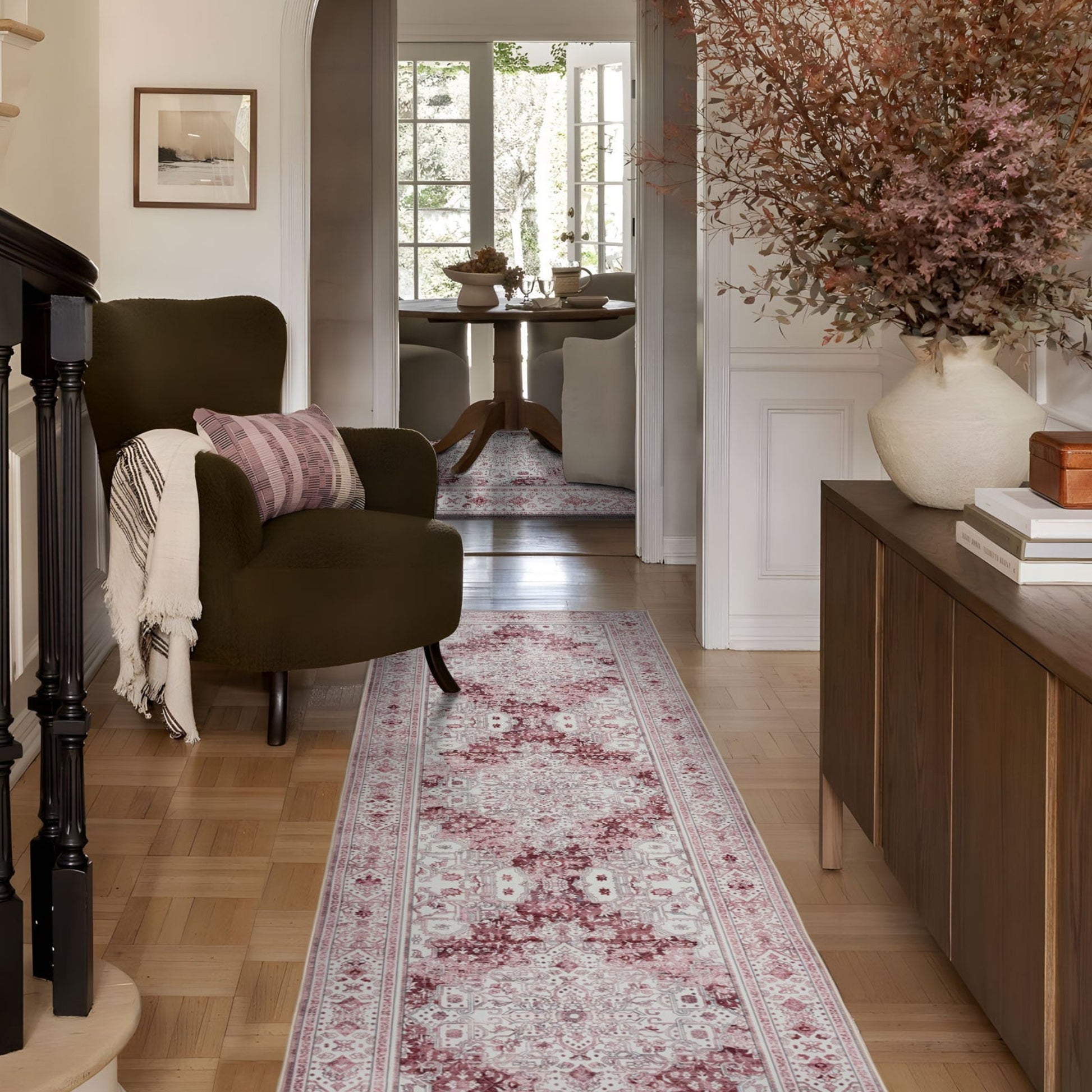 • Versatile Style: Whether your decor is modern, bohemian, or classic, the rug’s vintage charm and vibrant palette seamlessly complement diverse furniture styles, adding depth and warmth to living rooms, bedrooms, or entryways.